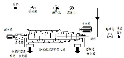 下圖描述了離心機的主要設備和系統進行工作時的工藝流程,該系統主要包括臥式螺旋卸料沉降離心機(主機)、電器控制系統、無軸輸送機、自動控制加藥系統。
